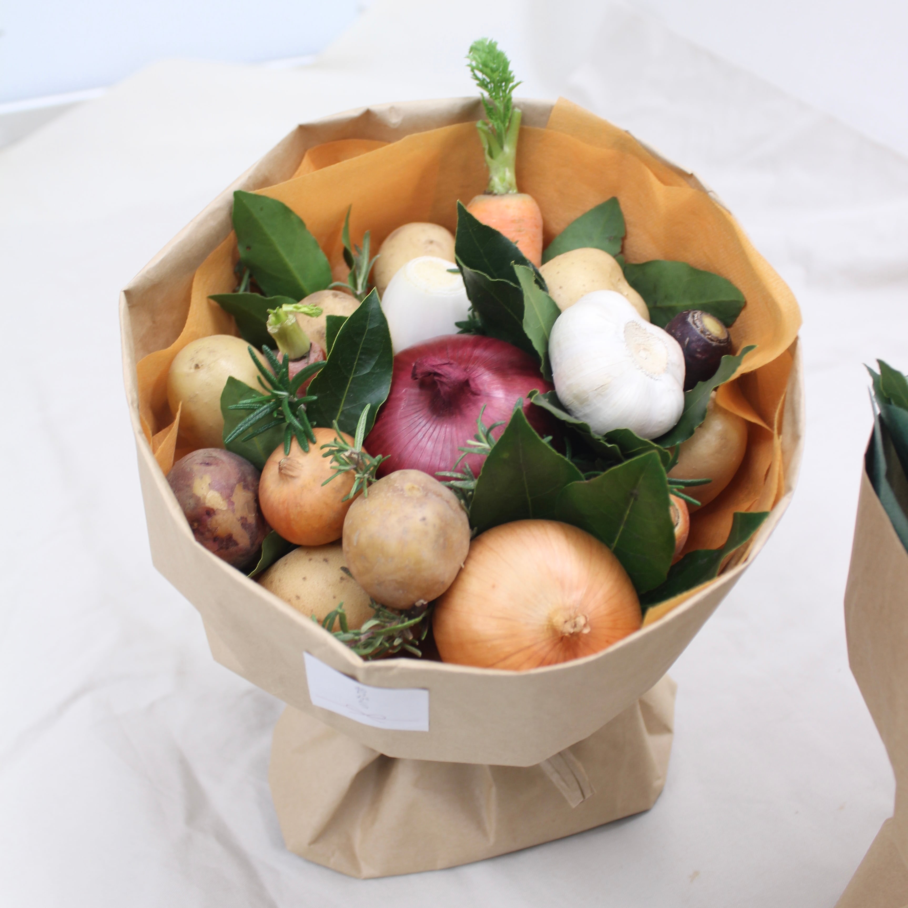 根菜やローリエなどの野菜をシチューのブーケにしてみました。観賞用ですので飾ってお楽しみください。