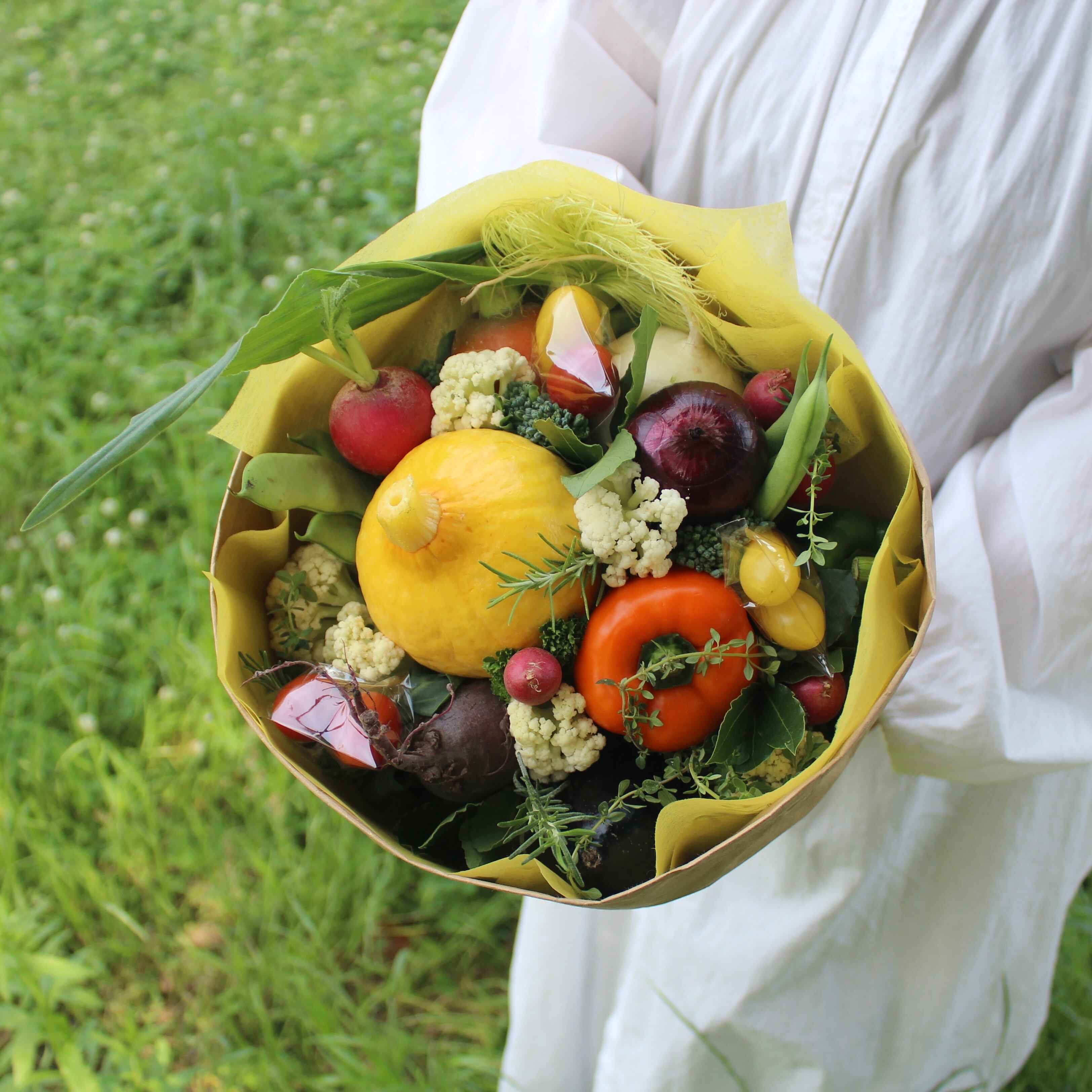 新鮮な数種類の季節のいろいろ野菜をかわいらしいブーケにしてみました。観賞用ですので飾ってお楽しみください。